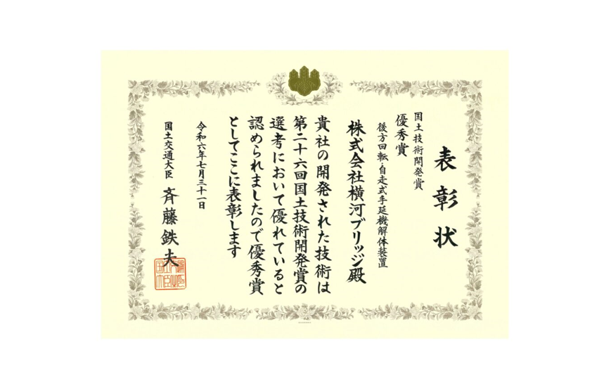 当社が開発した技術の「後方回転・自走式手延機解体装置」において当社と当社社員が国土交通大臣様より「第26回 国土技術開発賞 優秀賞」を受領しました2024.07.31表彰第26回 国土技術開発賞 優秀賞「後方回転・自走式手延機解体装置」(主催:(一財)国土技術研究センター 様、(一財)沿岸技術研究センター 様)表彰式前の記事へlist 記事一覧へ次の記事へ