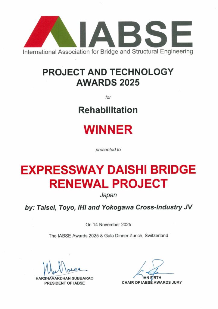 当社が施工に関わった「高速大師橋」が「IABSE AWARDS 2025」の「Rehabilitation(改修・再生)」部門の最優秀作品を受賞しました2025.11.28表彰この度の受賞に関するより詳細な情報は、首都高速道路株式会社様のプレスリリースにてご覧いただけます。前の記事へlist 記事一覧へ次の記事へ