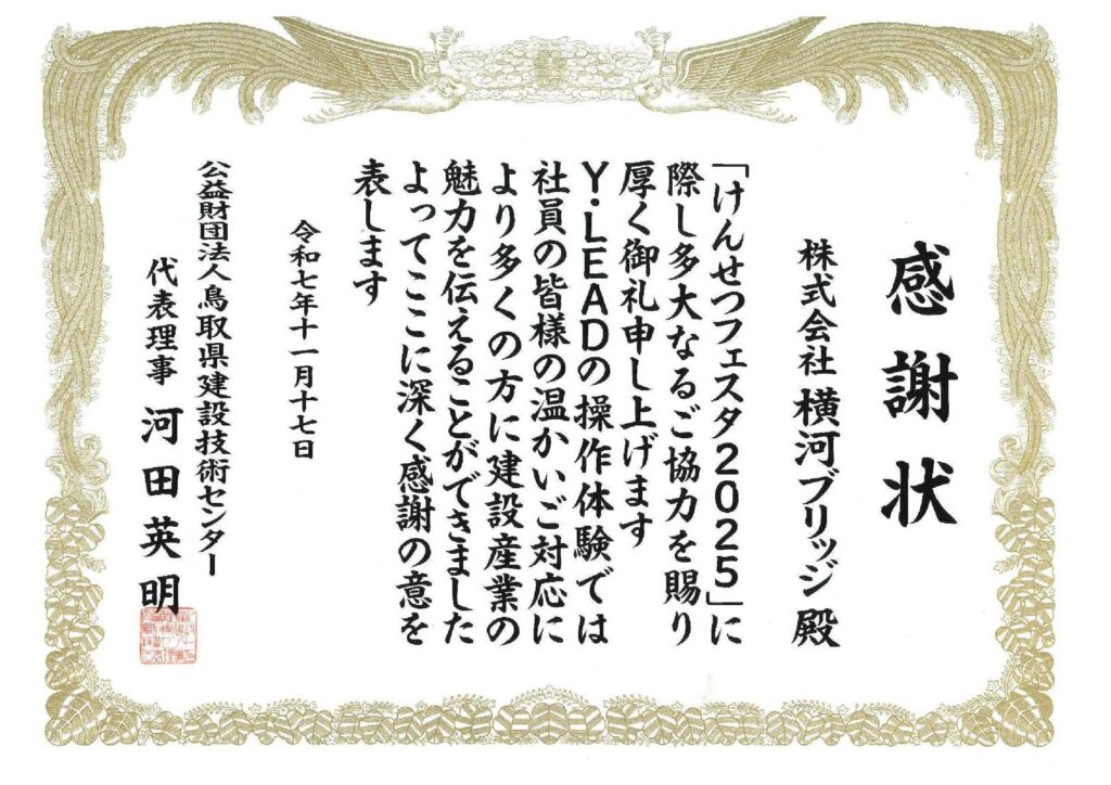 当社が「けんせつフェスタ2025」において(公財)鳥取県建設技術センター様より感謝状を受領しました